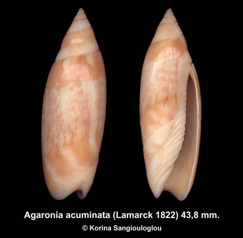 Agaronia acuminata (Lamarck 1822) Gorgeous!F+++/Gem 43,8 mm. Very beautiful. Cream, pale orange and beige color with cream/white spires and over the canal. White, cream, pale yellowish base, aperture and lip. Has slightly rough lip. From Greek trawlers. Senegal 1976