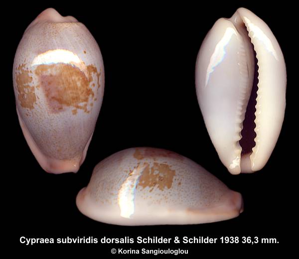 Cypraea subviridis dorsalis Schilder & Schilder 1938 Outstanding Large Bluish Superb!Gem 36,3 mm. Very beautiful. Bluish color background with tones of brown, beige large blotches, marks and dots. White margins and base. From my personal collection. Intertidal under slabs on reef. Port Hedland, Western Australia 1975