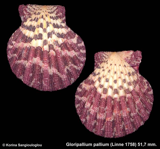 Gloripallium pallium (Linne 1758) Gorgeous Purple!F+++/Gem 51,7 mm. Very beautiful. Purple, cream, black and white colors attractive pattern and almost perfect lamellate ribs. Self collected under stone and dead coral at shallow water. Bunaken Isl. Manado, North Sulawesi May 1998