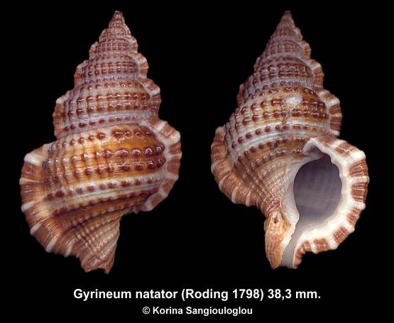 Gyrineum natator (Roding 1798) Gorgeous Large Dark!Gem 38,3 mm. Very beautiful. Tones of brown, beige, cream and white color bands with attractive brown, blackish spiral knobs and fine cords. White, brown ribbed aperture and lip with teeth. Taken under rocks at low tide. Pat Wadi, Mumbai, India 1982