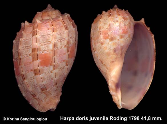 F+++/Gem 41,8 mm. Very beautiful. Cream color with attractive beige pattern and reddish/orange large marks. Ribs with cream, beige, brown, blackish marks and lines. Bluish/white, pale pink aperture with gray marks and thin lip. From Greek trawlers. Senegal, West Africa 1978